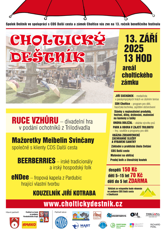 Benefiční festival Choltický deštník se uskuteční v sobotu 13. září od 13:00 hod. na zámku v Cholticích.